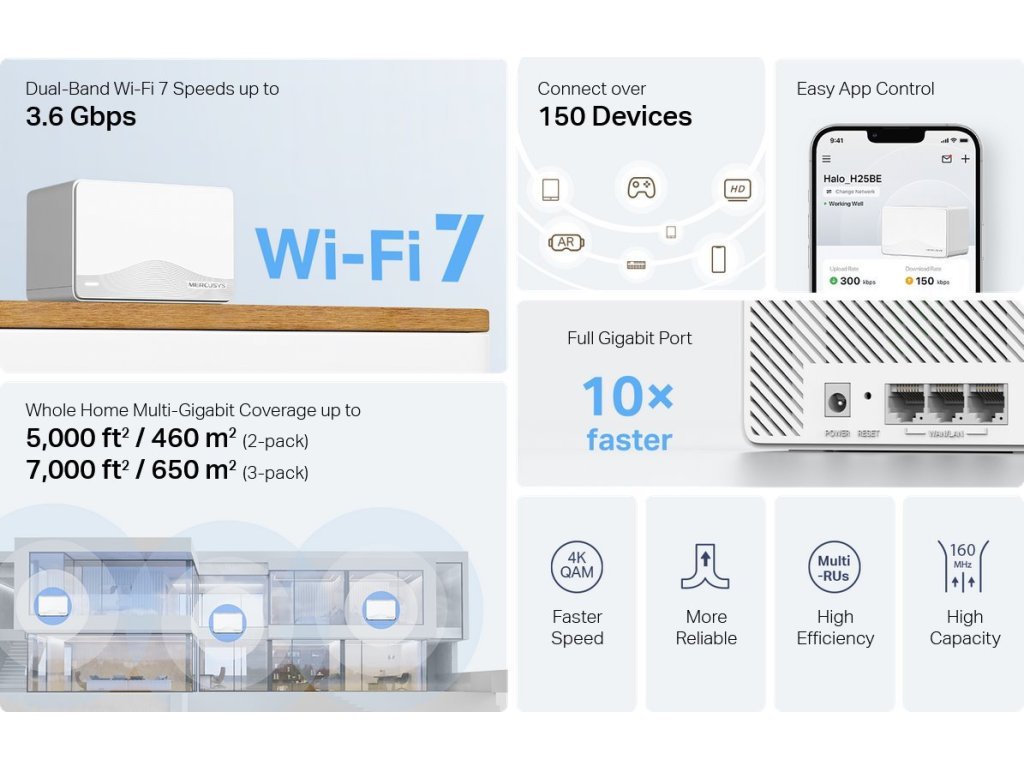 Každá jednotka má Wi-Fi 7 s modulačními rychlostmi 688 + 2880 Mbps (2.4 + 5 GHz) MU-MIMO s integrovanými anténami, třemi ethernetovými porty 3x 1 Gbps (LAN/WAN). Jednotky podporují MLO, šířku pásma 160 MHz, OFDMA, Beamforming, seamless roaming a pokrytí plochy až 460 m2 díky dvěma jednotkám v balení. Pokud potřebujete rozšířit pokrytí, stačí jednoduše dokoupit další jednotky. Jednotky Halo podporují IPv6. Vhodným doplňkem do moderní domácnosti je také oddělená síť pro hosty nebo rodičovská kontrola.