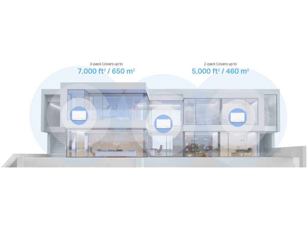 Každá jednotka má Wi-Fi 7 s modulačními rychlostmi 688 + 2880 Mbps (2.4 + 5 GHz) MU-MIMO s integrovanými anténami, třemi ethernetovými porty 1x 2.5 Gbps + 2x 1 Gbps (LAN/WAN). Jednotky podporují MLO, šířku pásma 160 MHz, OFDMA, Beamforming, seamless roaming a pokrytí plochy až 460 m2 díky dvěma jednotkám v balení. Pokud potřebujete rozšířit pokrytí, stačí jednoduše dokoupit další jednotky. Jednotky Halo podporují IPv6. Vhodným doplňkem do moderní domácnosti je také oddělená síť pro hosty nebo rodičovská kontrola.