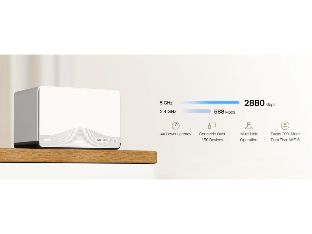 Dvoupásmový Wi-Fi 7 mesh systém s rychlostí 688 + 2880 Mb/s, porty 2.5G + 1G, MLO, 160 MHz a pokrytím 460 m2. Nabízí roaming, IPv6, guest síť i rodičovskou kontrolu.