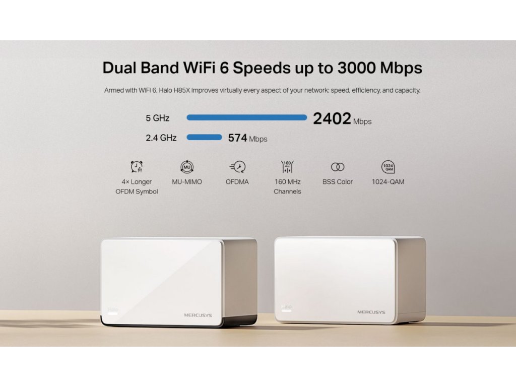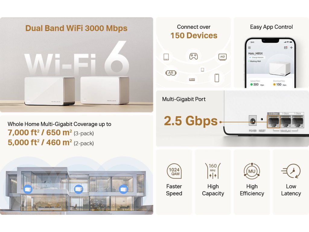 V balení naleznete 2 jednotky (H85X a H80X) s Dual-Band Wi-Fi AX3000 (574 + 2402 Mbps) MU-MIMO s integrovanými anténami a třemi ethernetovými porty (2x 1 Gbps + 1x 2.5 Gbps LAN/WAN u H85X a u jednotky H80X 3x Gbps LAN/WAN). Jednotky podporují MU-MIMO, 802.11r/k/v, OFDMA, Beamforming, pokryjete plochu až 460 m2. Pokud potřebujete rozšířit pokrytí, stačí jednoduše dokoupit další jednotky. Jednotky Halo podporují IPv6. Vhodným doplňkem do moderní domácnosti je také oddělená síť pro hosty nebo rodičovská kontrola.