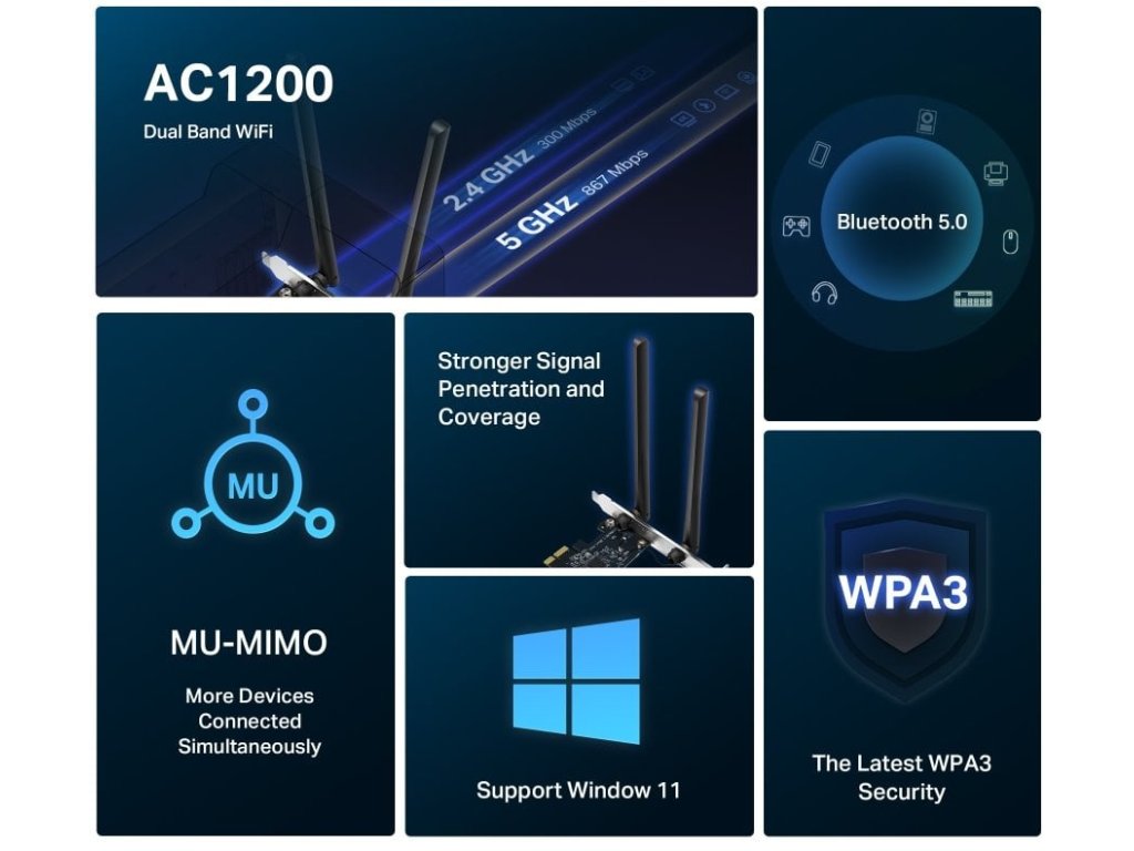 Kompaktní PCIe karta Dual Band 2,4/5 GHz s rychlostí 300/866 Mbps, Bluetooth 5.0, MU-MIMO a špičkovým zabezpečením WPA3 pro rychlé a stabilní Wi-Fi připojení.