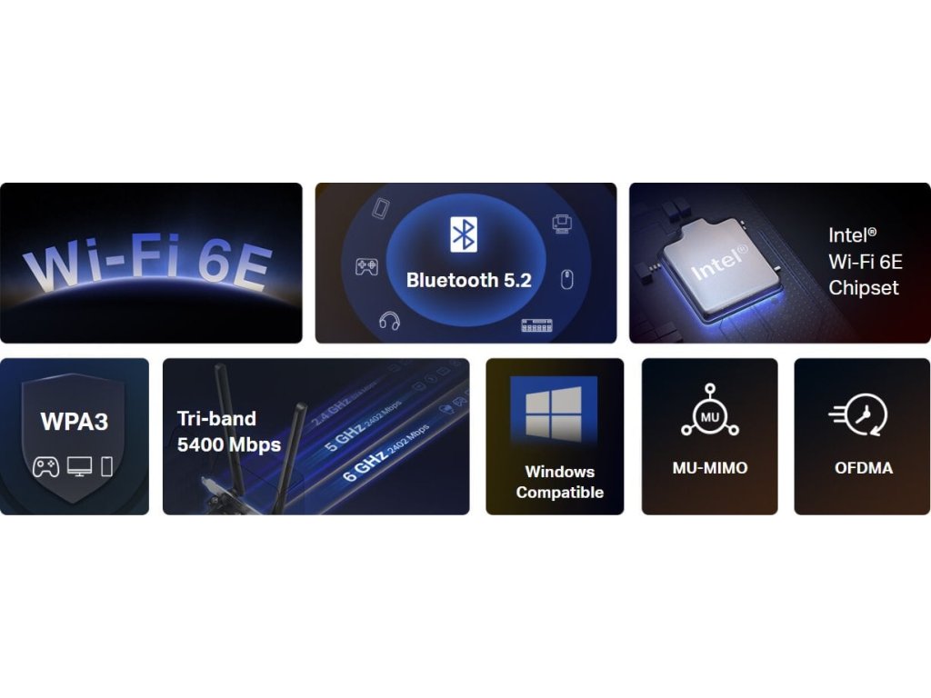 Kompaktní síťová karta do PCIe rozhraní, která je nejen vybavena nejnovějším standardem Wi-Fi 6E (6 GHz), Bluetooth 5.2 ale je také zpětně kompatibilní s 5 GHz (802.11a/n/ac) a 2.4 GHz. Poskytuje extrémní přenosovou bezdrátovou rychlost (2402 Mbps pro pásma 5 a 6 GHz a 574 Mbps pro pásmo 2.4 GHz), ultra nízkou latenci a nepřerušované připojení. Díky těmto vlastnostem si můžete užívat rychlejší stahování, plynulejší streamování a všepohlcující hraní.