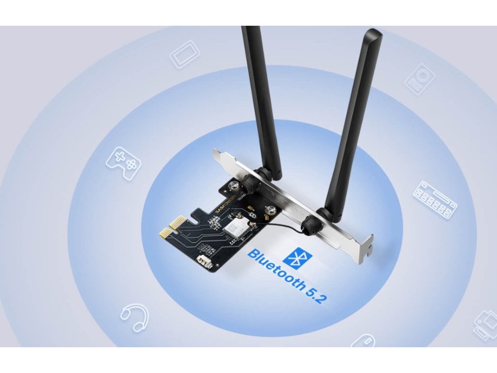 PCIe síťová karta Wi-Fi 6E + Bluetooth 5.2, třípásmová (2.4/5/6?GHz), rychlost až 2402?Mbps, MU-MIMO, OFDMA, nízká latence pro hraní a stream.