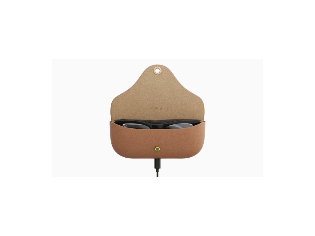 An open brown Meta Charging Case for Ray-Ban Meta AI glasses