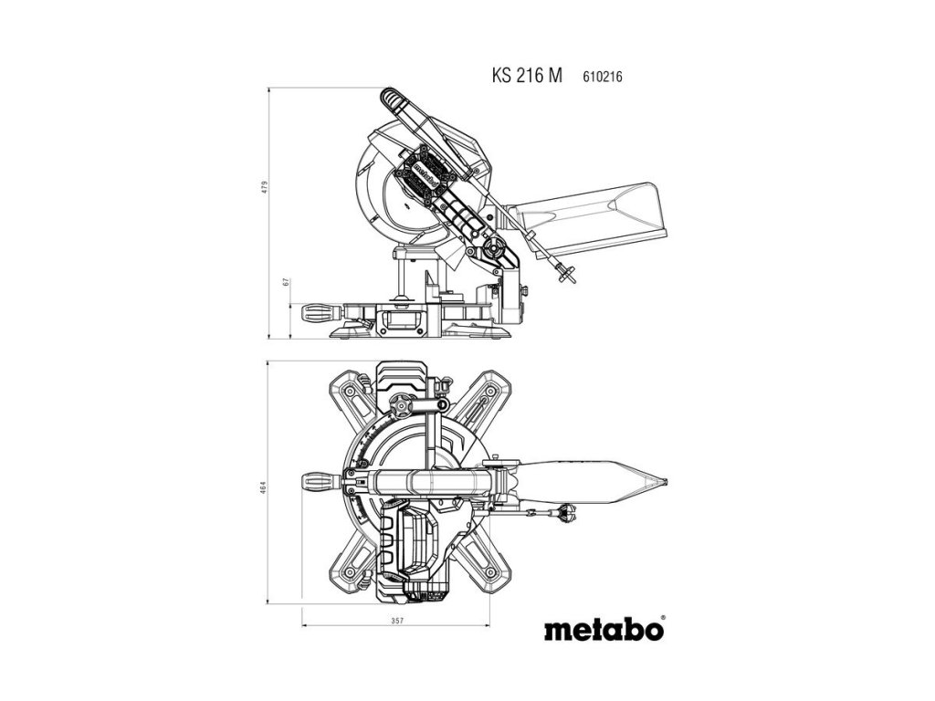 Metabo KS 216 M Lasercut Pokosová pila. Jmenovitý příkon 1100 W, max. šířka řezu 90°/45° 120 / 80 mm, max. hloubka řezu 90°/45° 60 / 45 mm, dosedací plocha 155 x 725 mm.