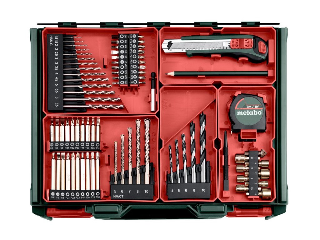 Mobilní dílna (78dílná): 5 vrtáků na dřevo (4/5/6/8/10mm), 5 vrtáků do kamene (5/6/7/8/10mm), 14 vrtáků HSS (1,5/1,5/2/2/2,5/3/3/3,5/4/4,5/5/5,5/6/6,5 mm), 20 šroubovacích bitů délky 25 mm (PH1/PH2/PH2/PH3/PZ1/PZ2/PZ2/PZ2/PZ3/H3/H4/H5/H6/T15/T20/T25/T30/S4/S5/S6), 10 šroubovacích bitů délky 50 mm (S4/S5/S6/PZ1/PZ2/PZ3/T15/T20/T25/T30), 10 šroubovacích bitů délky 75 mm (S4/S5/S6/PZ1/PZ2/PZ3/T15/T20/T25/T30), držák bitů (60 mm), 8 nástrčných klíčů (6/7/8/9/10/11/12/13 mm), záhlubník do dřeva (12,7 mm), středicí kolík (5x100 mm), řezací nůž se 2 náhradními čepelemi, svinovací metr (3 m/10"), tužka (HB)