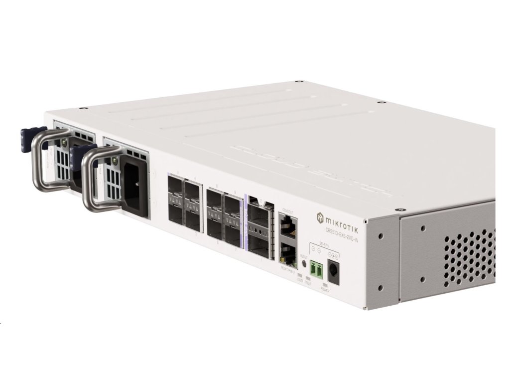 Optický Cloud Router Switch CRS510-8XS-2XQ-IN je vhodné 19" rackmount řešení pro distribuci 100 Gbps sítě a jako malý centrální optický switch, který nabízí 8x SFP28 s rychlostí 25 Gbps, 2x QSFP28 s rychlostí 100 Gbps, 1x ethernetový port s podporou napájení přes PoE a konzolový RJ45 port. Switch lze napájet jak přes dva redundantní Hot-swap zdroje, DC konektor / DC svorkovnici (36 - 57V DC), tak přes ethernetový port podporující PoE s napětím 43 - 57V DC nebo 802.3bt. Maximální spotřeba zařízení je 45W s připojenými SFP porty.