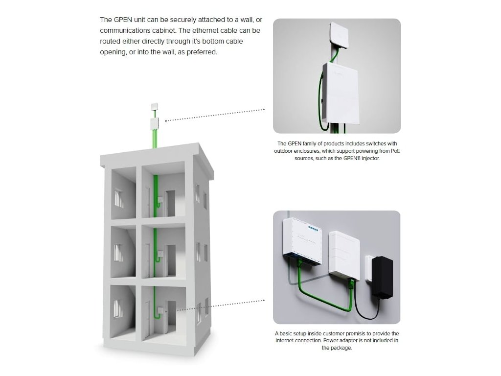 GPEN11 tak prostřednictvím PoE zprostředkovává napájení ISP routeru/switche venkovně instalovaného na objektu.