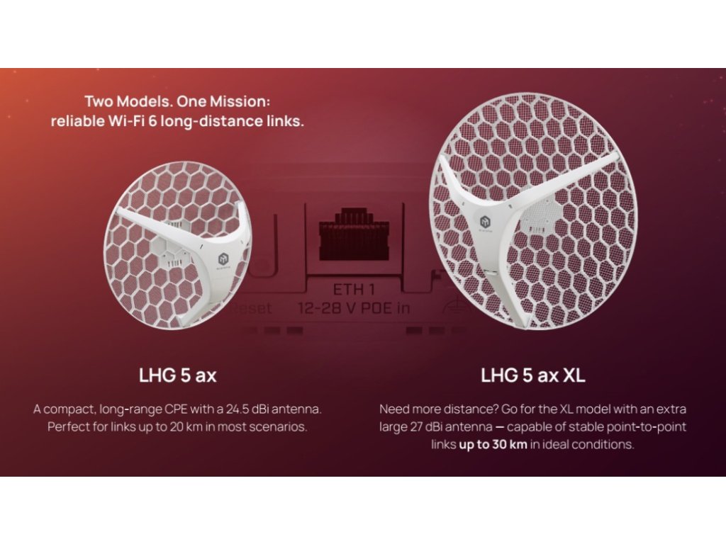 CPE jednotka LHG 5axD s anténou 24,5 dBi, standardem 802.11ax, RouterOS v7 a dosahem až 20 km pro rychlé a stabilní spojení.