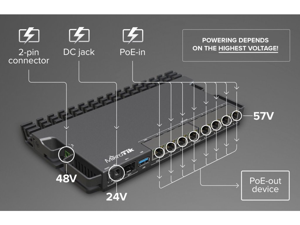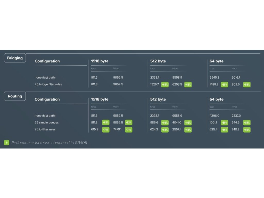 RB5009 je zcela nová řada RouterBOARDů, která přichází s pasivním chlazením, inovativním až futuristickým designem a vysokým výkonem (o 60 - 90 % vyšší než RB4011) o který se zasluhuje 64bit ARM architektura procesoru s taktem 1400 MHz, 1GB RAM typu DDR4 a 1GB NAND uložiště. Router disponuje 7× Gigabit LAN, 1× 2.5Gbit LAN s možností PoE IN i PoE OUT (802.3af/at) na všech osmi ethernetových portech s celkovým PoE budgetem 130 W, DC jack či svorkovnici z levého boku (24 .. 57V DC), 1× SFP+ slot a 1× USB 3.0. Právě díky designu kovového šasi je možné s dokoupitelným příslušenstvím namontovat router do 19" racku. Dokonce až 4 routery naráz se díky úsporným rozměrům vměstnají do 1U výšky!