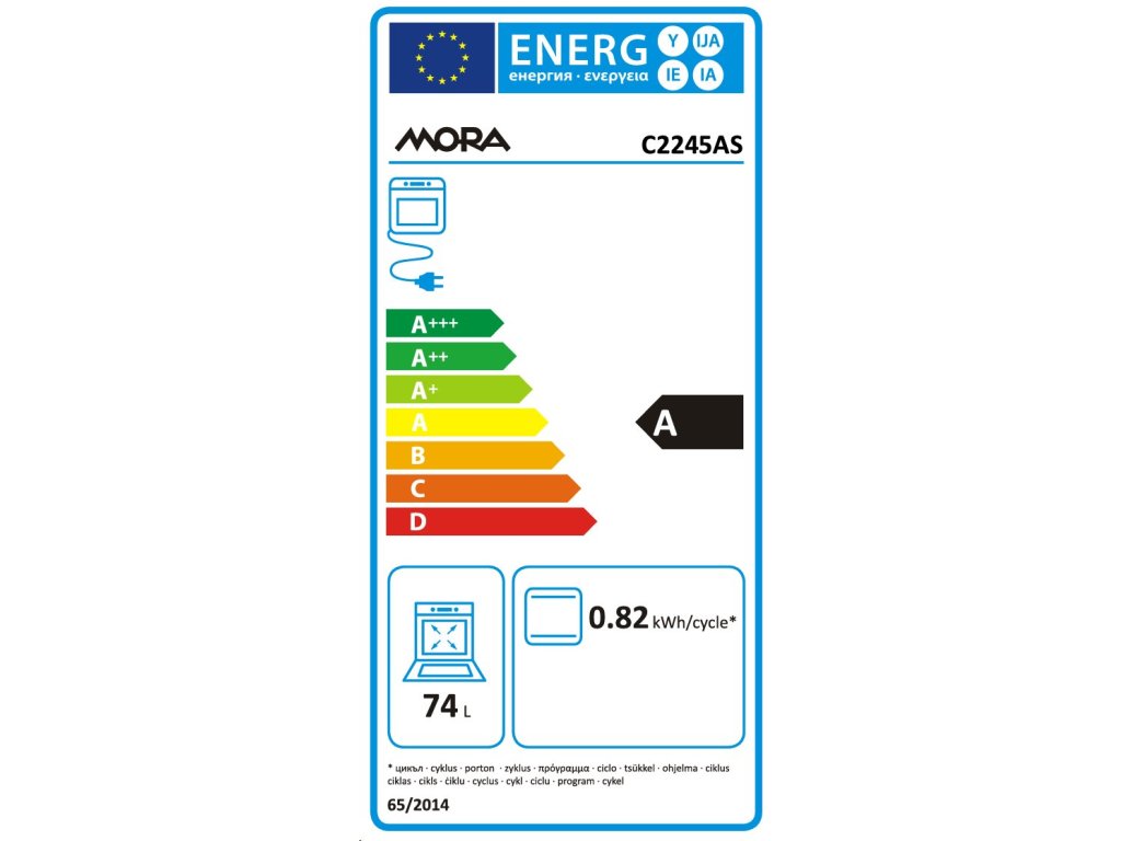 Elektrický sporák Mora C 2245 AS v nerezovém provedení se sklokeramickou deskou svým klasickým vzhledem s praktickými otočnými knoflíky zapadne do jakékoliv kuchyně. Vnitřní prostor trouby nabízí velký užitný objem 74 litrů, takže spolehlivě najde uplatnění i ve větších rodinách. Trouba nabízí možnosti pečení pomocí horního a dolního topného tělesa a dává možnost regulace teploty v rozmezí 50–275 °C. Pro lepší přehled o průběhu pečení je interiér trouby vybaven osvětlením. Kromě klasického pečení má trouba ještě funkci EcoClean, která umožňuje snadnější čištění pomocí páry.