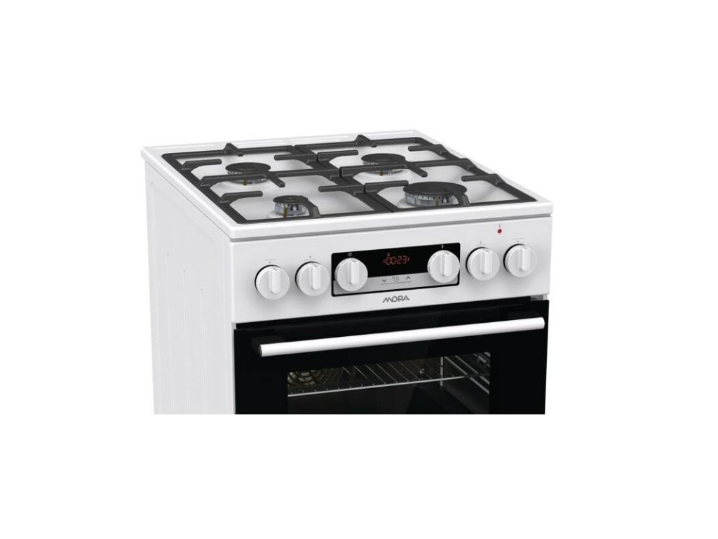 Kombinovaný sporák Mora K 7668 BW v bílém provedení s multifunkční troubou v objemu 70 l Vás překvapí energeticky úspornou třídou A. Plynové hořáky s pojistkami STOP GAS a integrovaným zapalováním jsou kryté dvoudílnou mřížkou STABIL PLUS, která zajišťuje bezpečný posun nádobí ve všech směrech. Díky digitálnímu časovému spínači s hodinami se Vám již nikdy nespálí oběd, tato praktická funkce Vám přinese mnoho užitku.