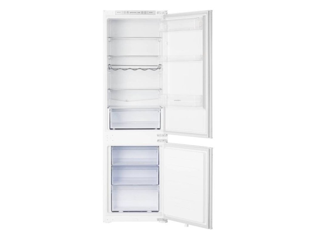 Vestavná kombinovaná lednička s mrazákem dole, objem 183/63 litrů, energetická třída E, barva bílá, roční spotřeba energie: 217 kWh, technologie NoFrost, funkce SuperCool, LED displej, hlučnost 39 dB, výška 177,2 cm, šířka 54 cm.