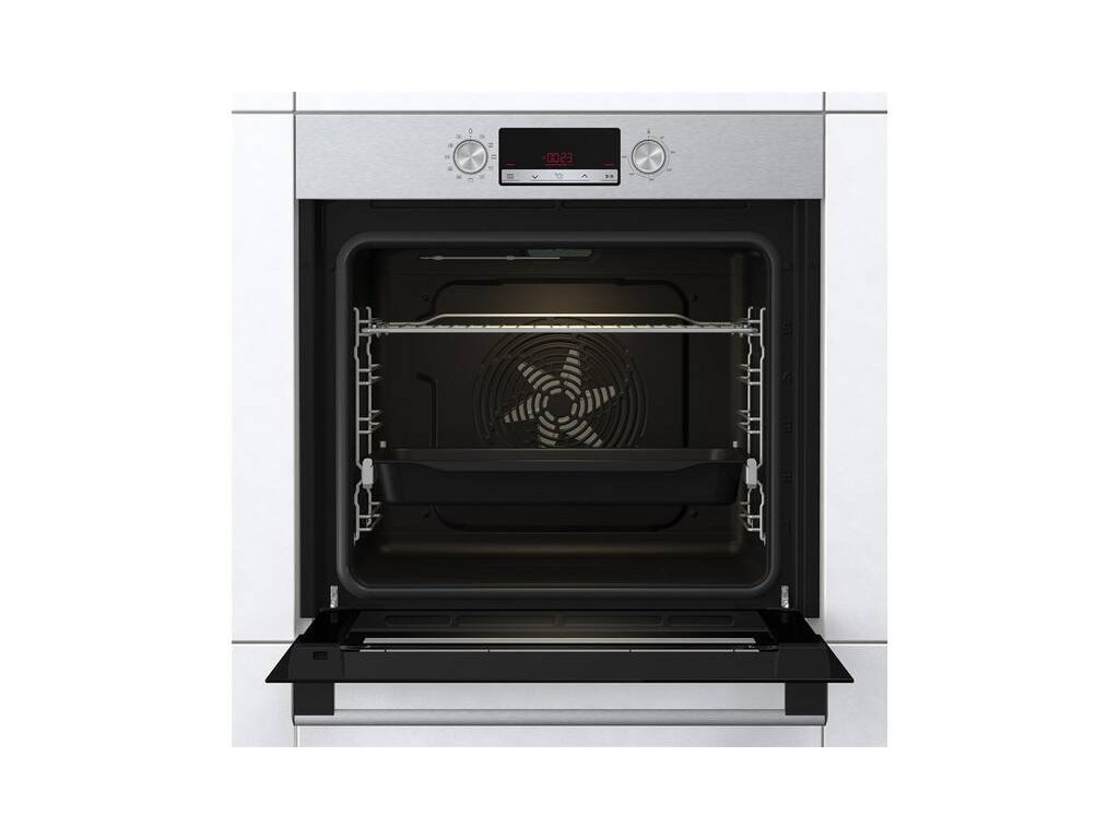 vestavná elektrická trouba • energetická třída A • objem 77 l • teleskopické výsuvy • displej • ECO clean čištění • funkce Horký vzduch • program Pomalé pečení