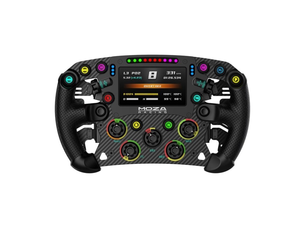 Herní volant, styl formule, karbon, 4,3" přizpůsobitelný dotykový displej, 480p @ 60 Hz, RGB diody, 10 podsvícených tlačítek, 5 otočných knoflíků, 2 sedmisměrné přepínače, čtyřjádrový 1,3 GHz procesor