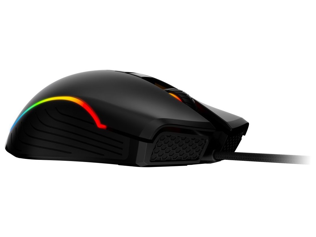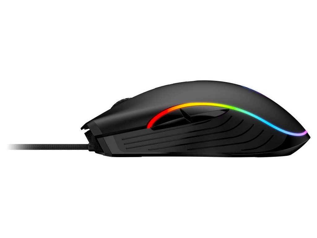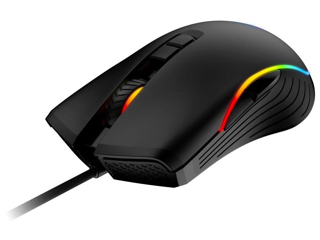 Herní drátová myš disponující 5 režimy RGB podsvícení a optickým senzorem s nastavitelným rozlišením až 7200 DPI. Kvalitní spínače vydrží až 10 milionů kliků. Skvělá ergonomie spolu s nízkou hmotností přispívá k pohodlnému používání.