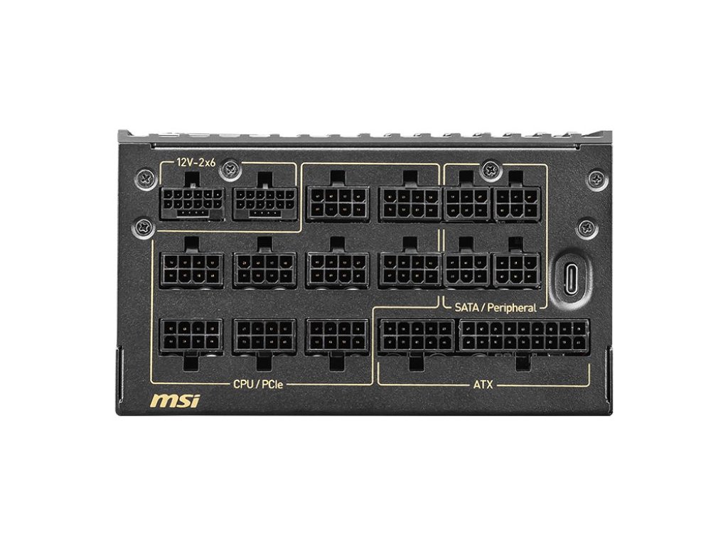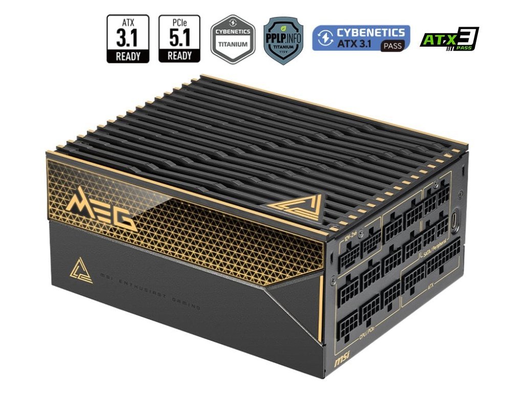 Napájecí zdroj o výkonu 1600 W je osazen tichým a přitom výkonným 135 mm velkým ventilátorem. Zdroj splňuje certifikaci 80PLUS Titanium, standard ATX 3.1 a má odpojitelné kabely. Prostřednictvím MSI Gaming Intelligence je možné v reálném čase sledovat spotřebu jednotlivých komponentů či nastavovat rychlost ventilátoru.