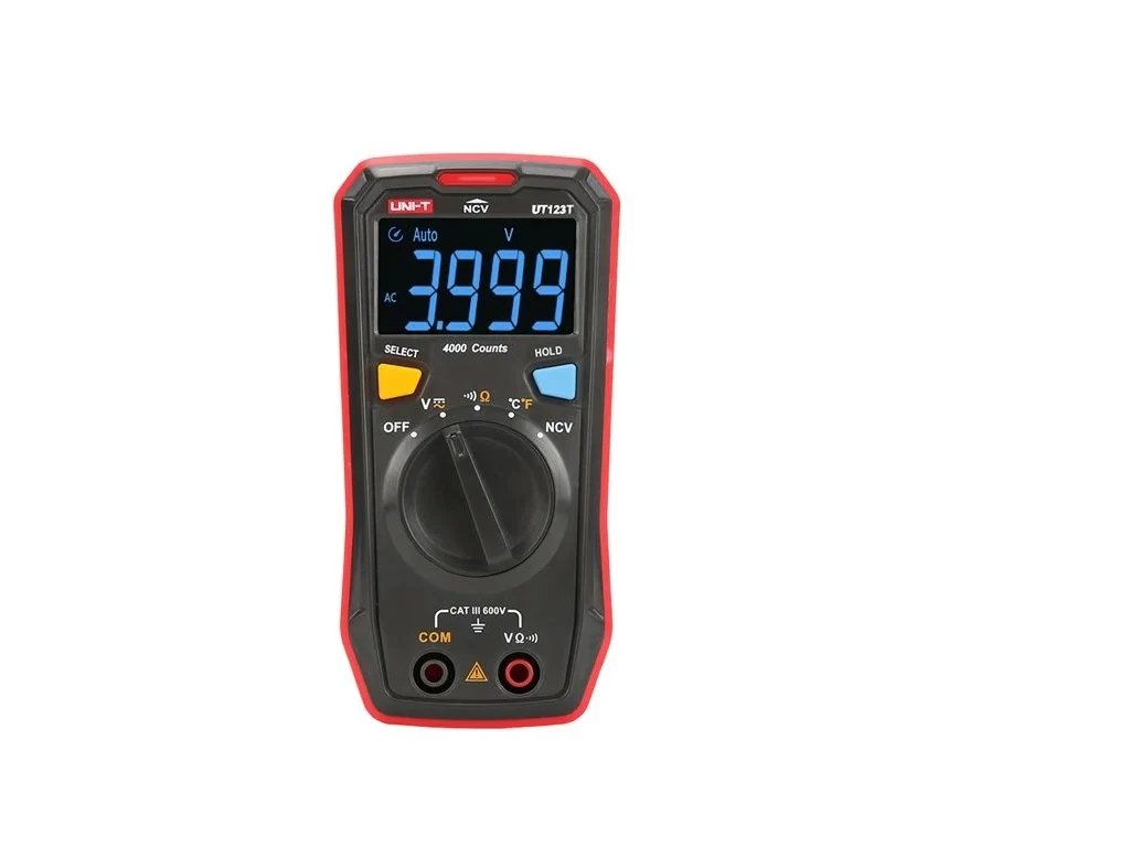 Multimetr UNI-T UT123T je jednoduchý kapesní přístroj pro domácí použití. Kompaktní struktura usnadňuje držení v jedné ruce a displej typu EBTN umožňuje uživatelům získat čitelně zobrazené hodnoty při maximálním úhlu. Inteligentní bezkontaktní detekce elektrického pole AC, která rozlišuje slabé, silné a super silné elektrické pole.