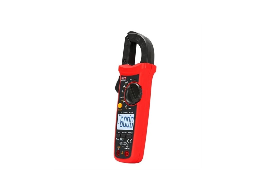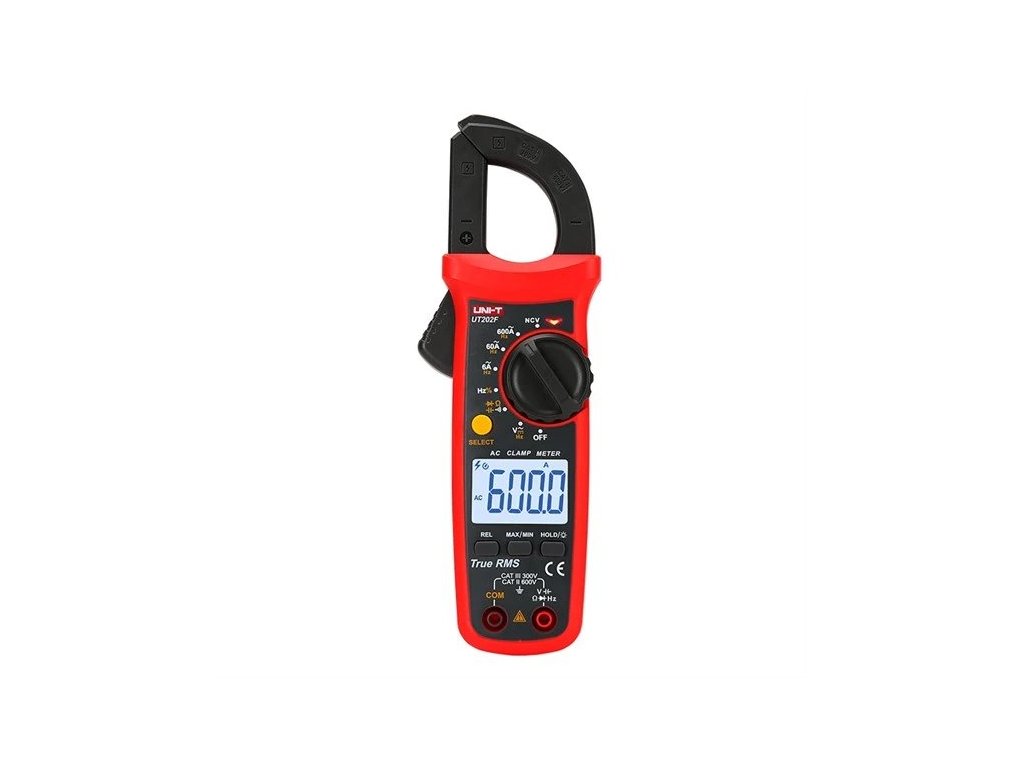 Digitální klešťový měřič UT202F slouží pro měření střídavých a stejnosměrných napětí do 600V, AC proudů do 600A a frekvece napětí do 600V. Na všech rozsazích má ochranu před větším napětím než 600V a zvukový a optický alarm. Čtyřmístný více segmentový displej o rozměru 37 x 25 mm se zadním podsvícením a rychlou obnovovací frekvencí (3krát/s) . Rozevření čelistí umožňuje měření na kabelech o průměru až 28mm. Bezkontaktní snímání elektrického pole (NCV) umožňuje detekovat vodiče pod napětím ve dvou citlivostech -EFLo a - EFHi pro rozvody nn 110V/50/60Hz a 230V/50/60Hz. Přiložená sonda - kryt hrotů na testovacích kabelech umožňuje měření na rozvodech nn v kategorii CAT III bez nebezpečí vzniku oblouku. Bez krytů na hrotech lze měřit testovacími kabely jen na rozvodech nn kategorie CAT II. Napájecí baterie 2ks 1,5V R03. Příkon měřiče je cca 1,8 mA. Obvod má funkci automatické úspory energie. Spotřeba v režimu spánku je <11µA, což účinně prodlužuje životnost baterie na cca 400 hodin.