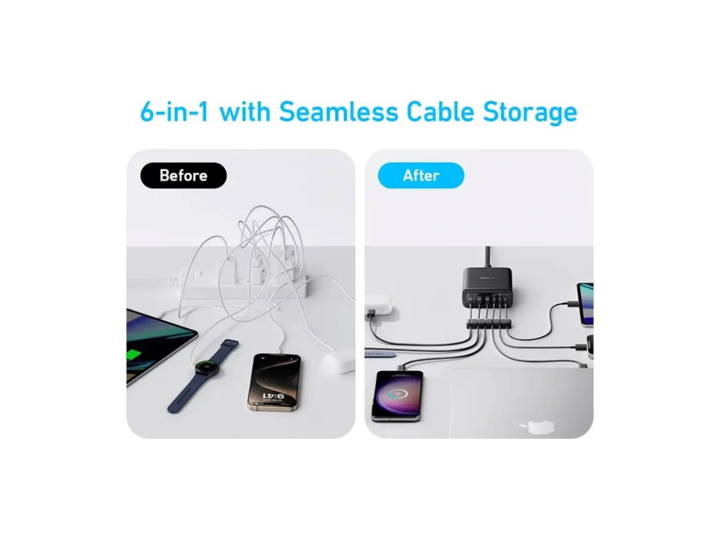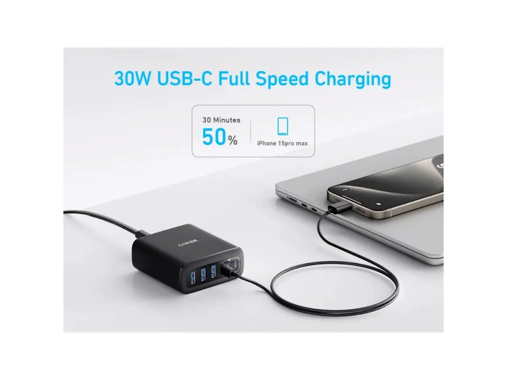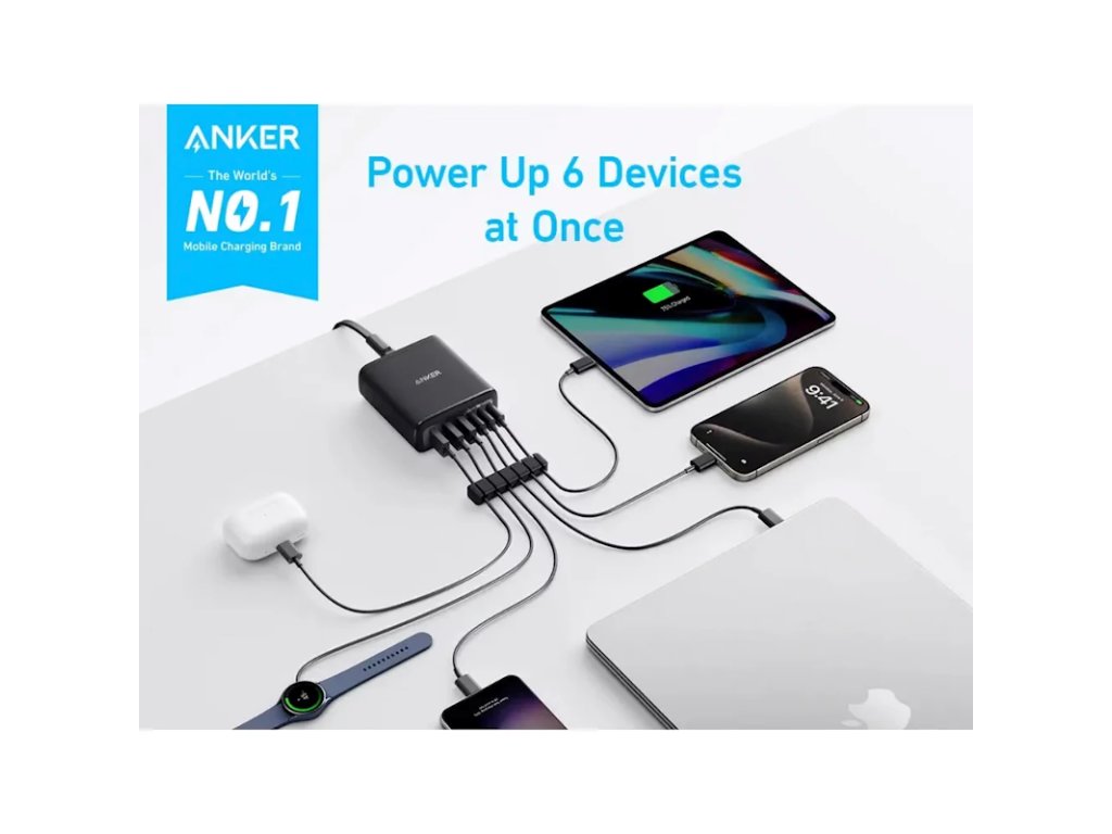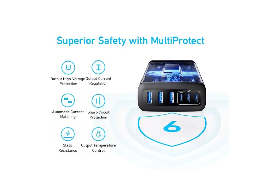 Nabíjecí stanice Anker, výkon 112W, porty 3xUSB-C, 3xUSB, rychlé nabíjení, technologie MultiProtect chrání proti přepětí, přehřátí a zkratu, rozměr: 76,8×81,6×32,9mm, váha 302g, barva černá