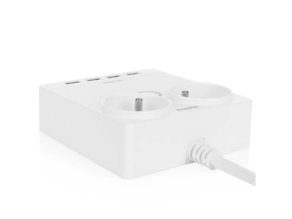Prodlužovací kabel 2 zásuvky + 4x USB, délka kabelu 1,5m, plochý, obdélníkový, silná šňůra, litá zástrčka, na spodní straně pogumované body, které přilnou k povrchu, signální světlo ve vypínači, rychlé a snadné zapnutí/vypnutí