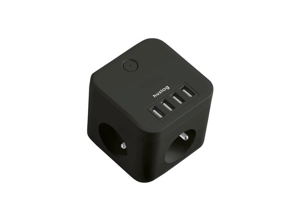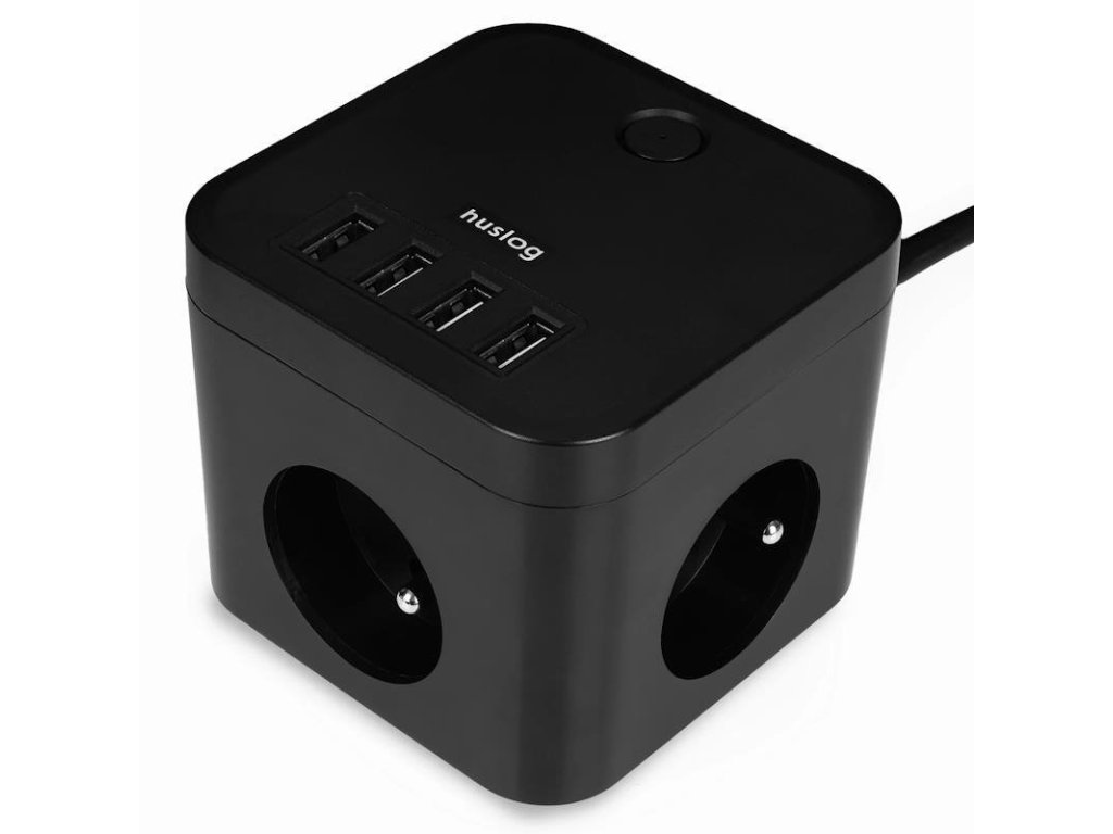 Prodlužovací kabel Huslog 3x zásuvka + 4x USB, design ve tvaru kostky, silná šňůra, litá zástrčka, uzemění, délka kabelu 1,5m, 4 pogumované body na spodní straně, signální světlo ve spínači, dioda vyzařujicí jemné světlo, černý
