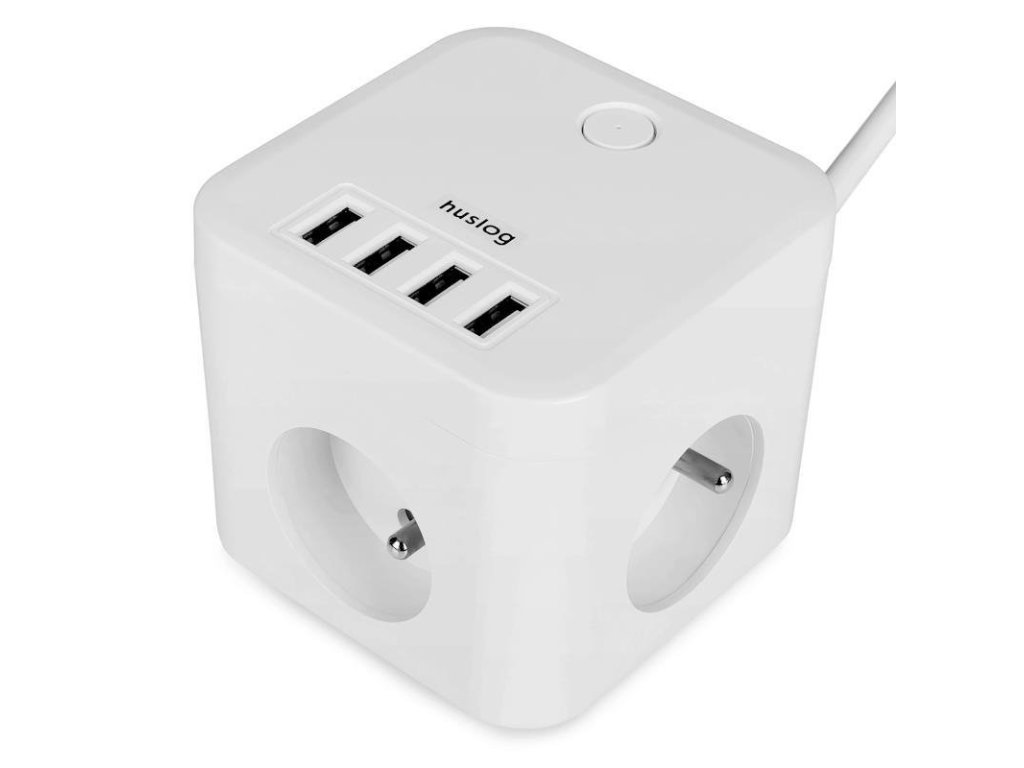Prodlužovací kabel Huslog 3x zásuvka + 4x USB, design ve tvaru kostky, silná šňůra, litá zástrčka, uzemění, délka kabelu 1,5m, 4 pogumované body na spodní straně, signální světlo ve spínači, dioda vyzařujicí jemné světlo, bílý