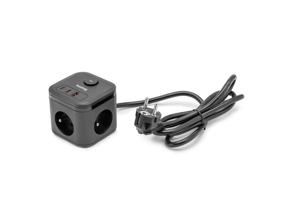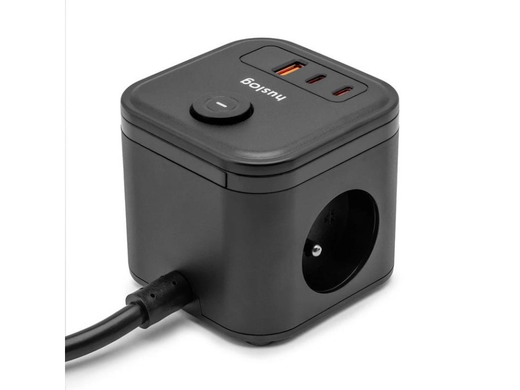 Nabíjecí stanice Huslog , výkon 20W - podporuje rychlé nabíjení PD, konektory - 3xzásuvka, 2xUSB-C, 1xUSB, vypínač pro vypnutí/zapnutí nabíjecí stanice, rozměr 8 × 8 × 7,4 cm, délka kabelu 140 cm, hmostnost 360g, pogumované nožičky, barva černá