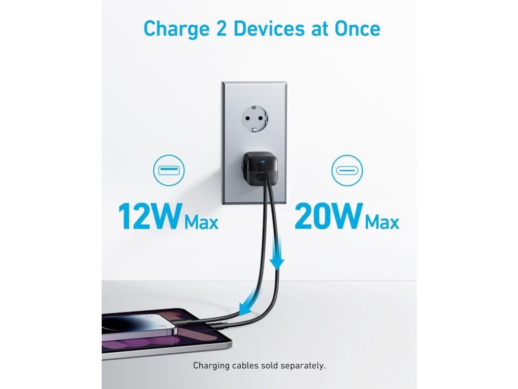Připojte jedno zařízení k portu USB-C pro nabíjecí výkon 20 W a připojte další zařízení k portu USB-A pro rychlost nabíjení až 12 W. Účinnost a všestrannost v kompaktním nabíjecím kabelu.