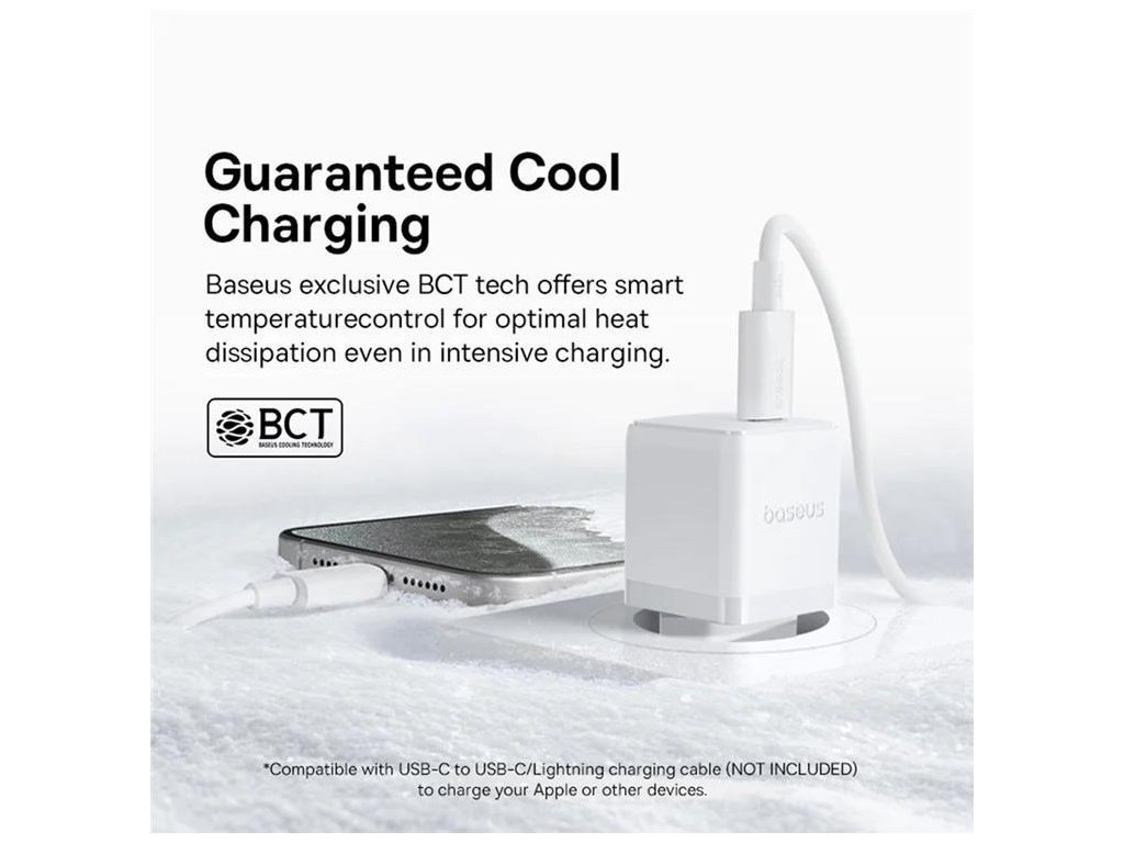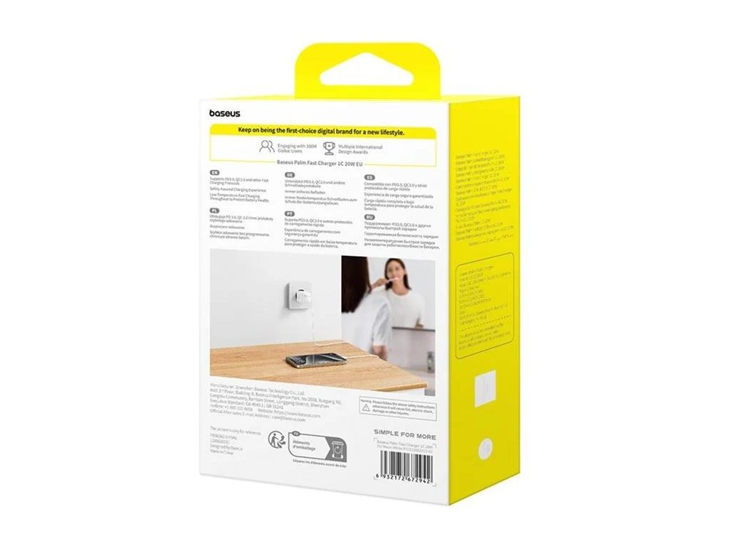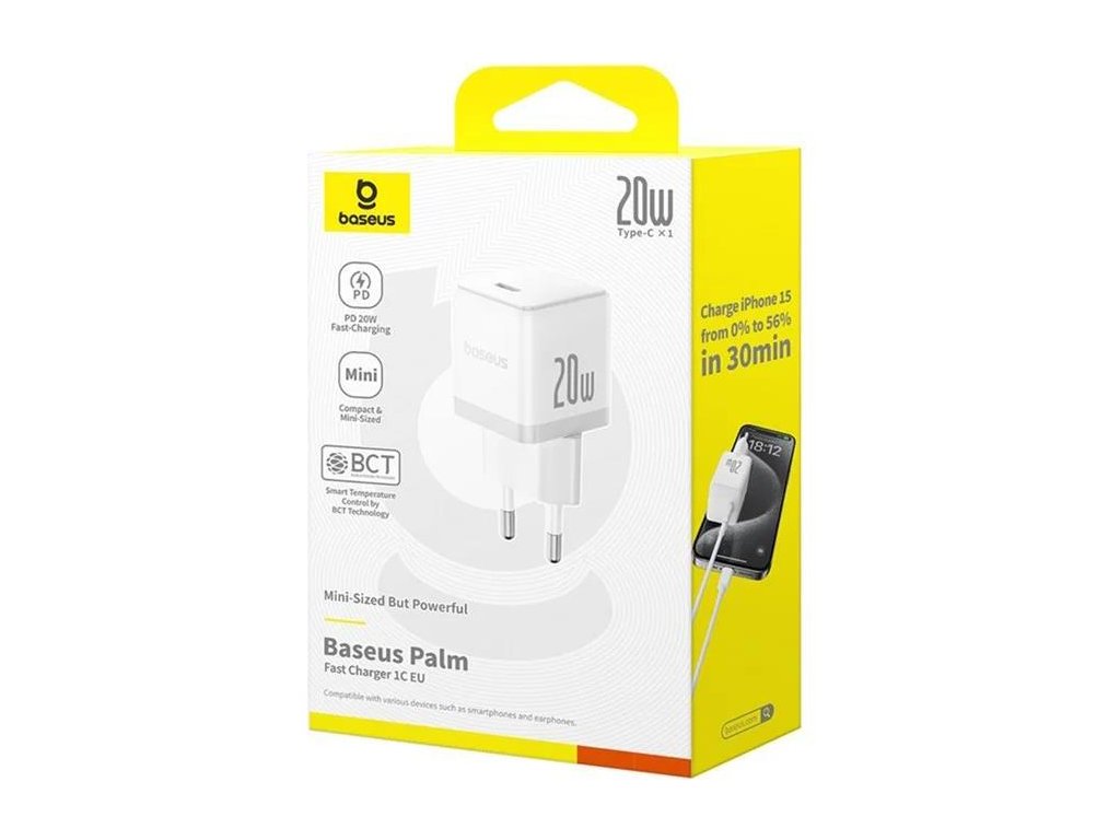 Nabíječka do sítě Baseus Palm, výkon 20W, rychlonabíjení,podporuje PD3.0, QC3.0 a další protokoly rychlého nabíjení, výstup 1xUSB-C ,garantované chladné nabíjení: exkluzivní technologie Baseus BCT,barva bílá