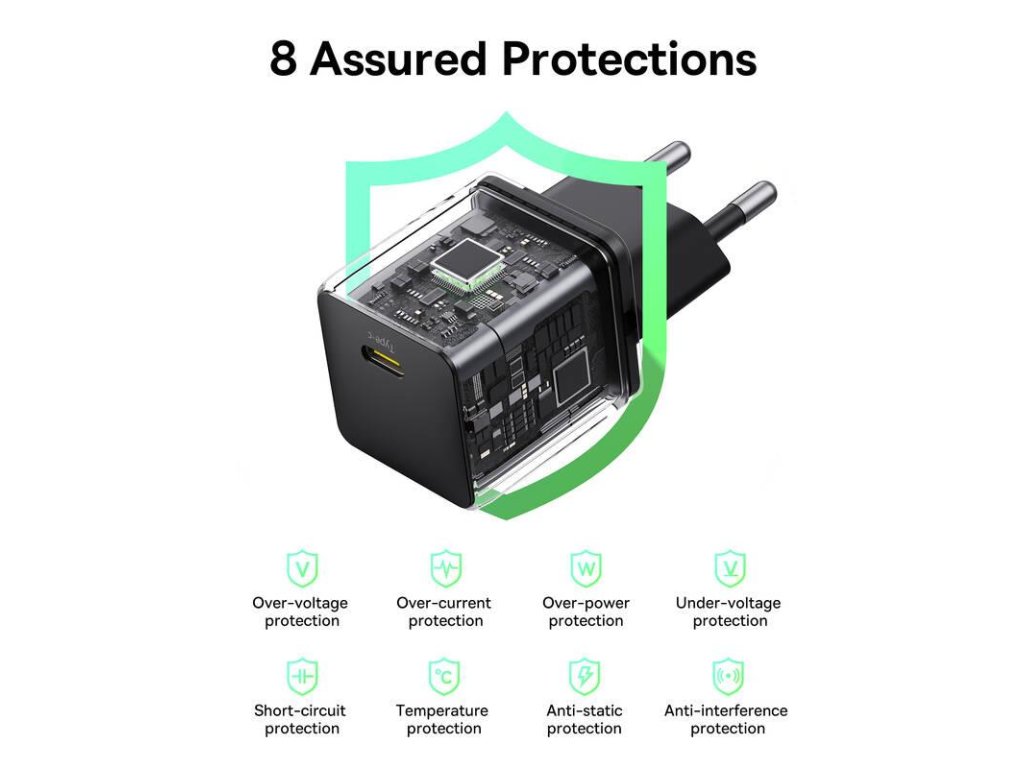 Bezpečnost je klíčová, a proto Baseus Palm Fast Charger obsahuje až 9 různých ochranných mechanismů, včetně ochrany proti přepětí, podpětí, přetížení a zkratu. Tyto bezpečnostní prvky zajišťují, že vaše zařízení je vždy v bezpečí, bez rizika poškození. Nabíječka nabízí výstup USB-C s výkonem až 20 W, což umožňuje efektivní nabíjení široké škály zařízení – od chytrých telefonů po tablety.