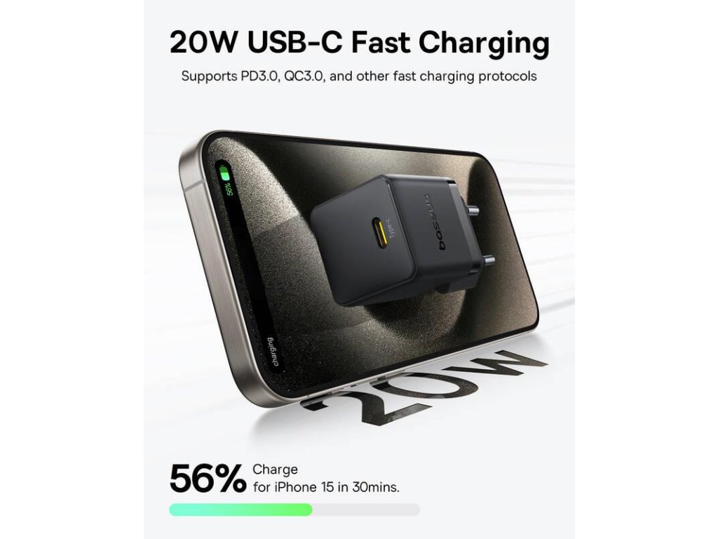 Nabíječka do sítě Baseus Palm, výkon 20W, rychlonabíjení,podporuje PD3.0, QC3.0 a další protokoly rychlého nabíjení, výstup 1xUSB-C ,garantované chladné nabíjení: exkluzivní technologie Baseus BCT,barva černá
