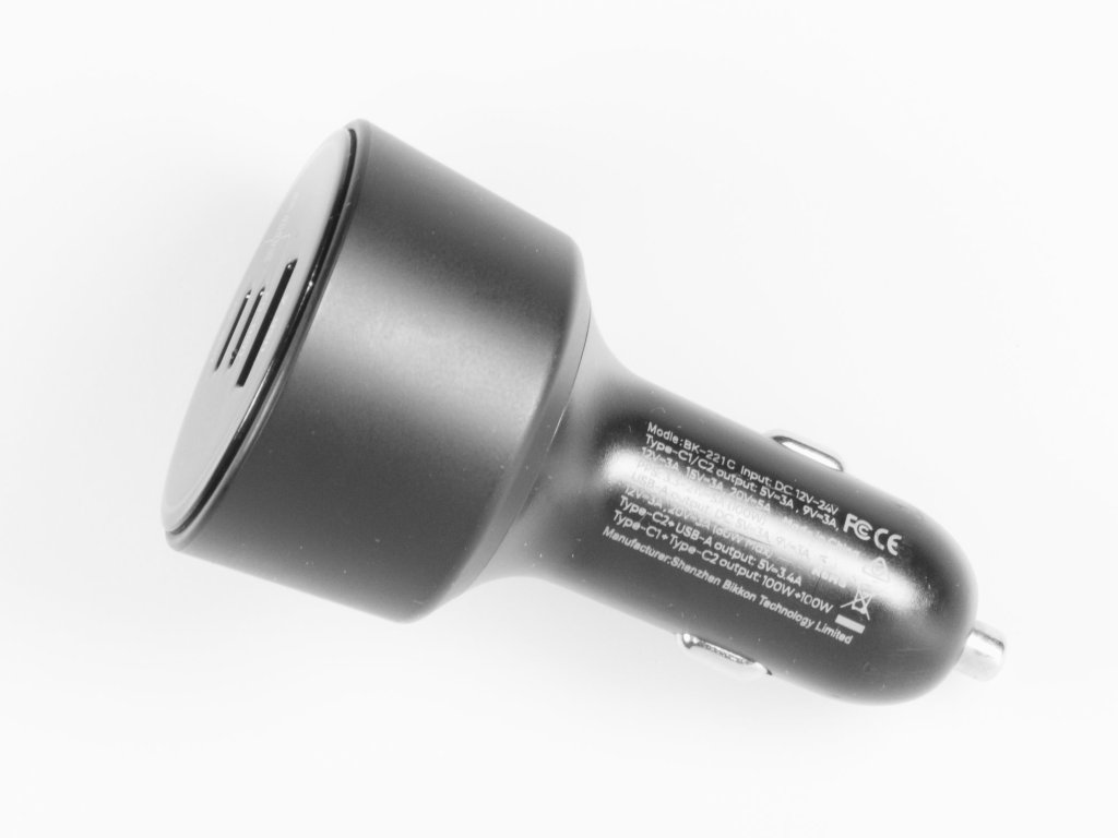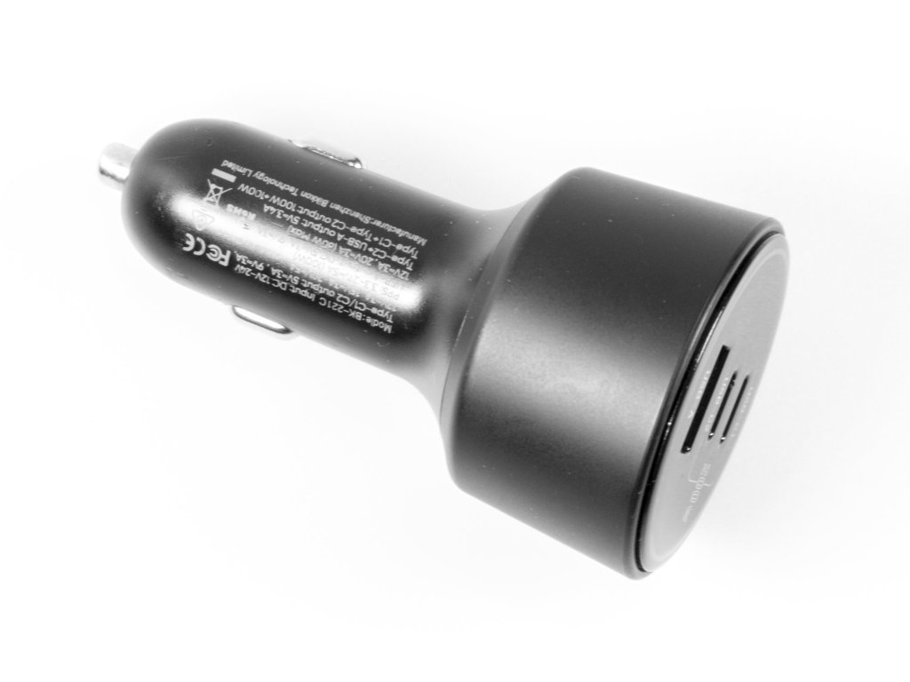 Autoadaptér určený pro notebooky s max. příkonem 100W, výstup USB-C, podporuje PD (power delivery) a QC 3.0 (quick charge), v balení 1m kabel USB-C -> USB-C