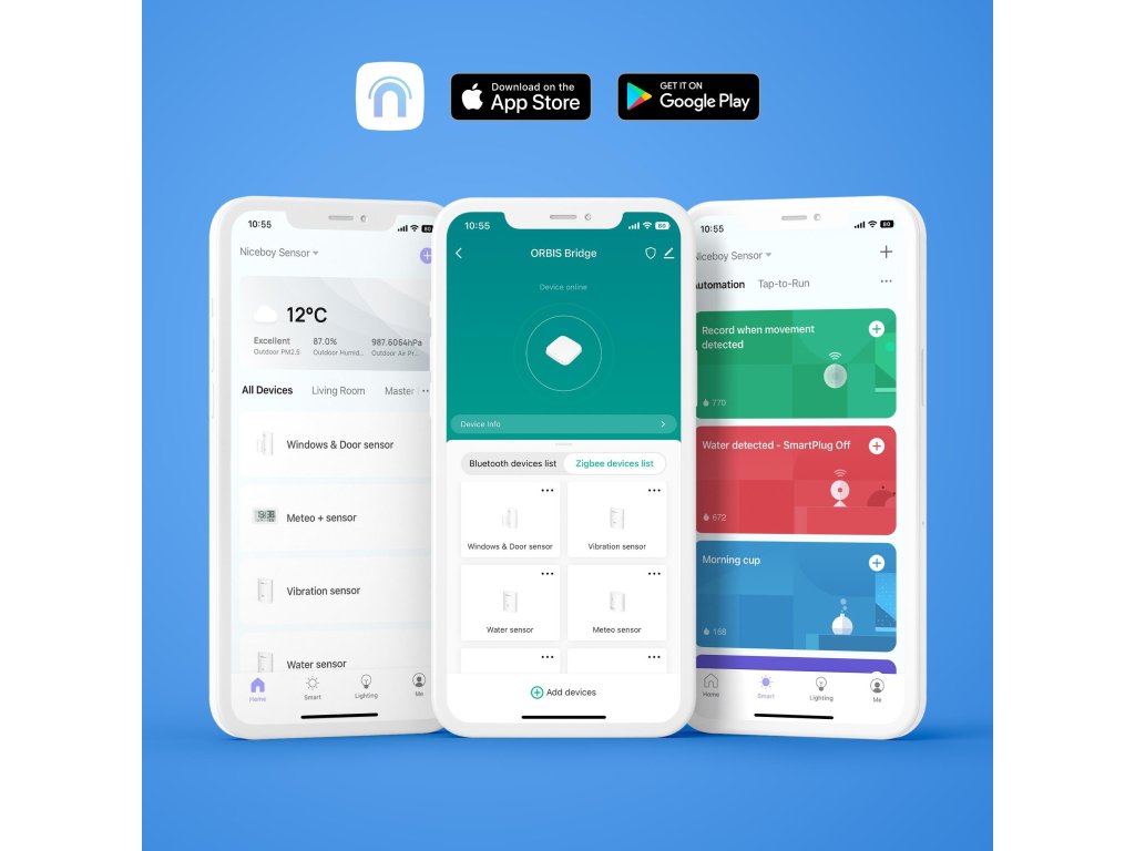 Kompletní ovládání senzoru Niceboy ION ORBIS Bridge naleznete v mobilní aplikaci Niceboy ION, která navíc podporuje mnoho jazyků (včetně češtiny a slovenštiny). Z aplikace kromě senzorů ovládáte i všechny produkty chytré domácnosti Niceboy ION a jejich ovládání lze sdílet i mezi ostatní členy domácnosti. Ze svého telefonu si u zařízení pohodlně nastavíte parametry, vytvoříte chytré scénáře, časové plány nebo zorganizujete svá zařízení do skupin. Na váš telefon také chytrá zařízení Niceboy ION posílají upozornění a informace o změnách stavu, takže máte vždy přehled, co se ve vaší domácnosti děje.