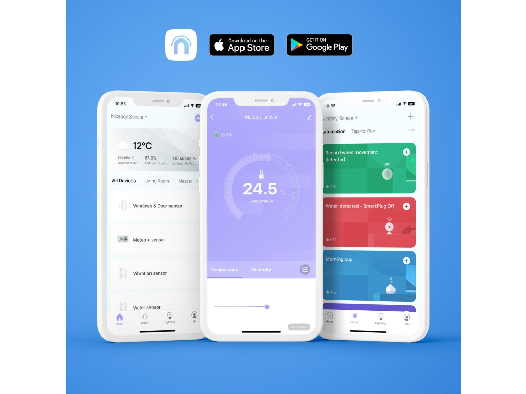 Kompletní ovládání senzoru Niceboy ION ORBIS Meteo+ Sensor naleznete v mobilní aplikaci Niceboy ION, která navíc podporuje mnoho jazyků (včetně češtiny a slovenštiny). Z aplikace kromě senzorů ovládáte i všechny produkty chytré domácnosti Niceboy ION a jejich ovládání lze sdílet i mezi ostatní členy domácnosti. Ze svého telefonu si u zařízení pohodlně nastavíte parametry, vytvoříte chytré scénáře, časové plány nebo zorganizujete svá zařízení do skupin. Na váš telefon také chytrá zařízení Niceboy ION posílají upozornění a informace o změnách stavu, takže máte vždy přehled, co se ve vaší domácnosti děje.