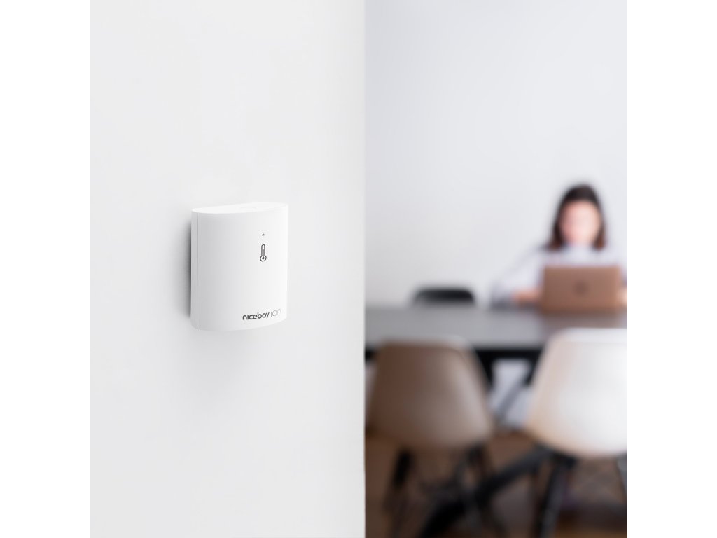 Vnitřní senzor teploty a vlhkosti. Práce s aplikací Niceboy ION. Vyžaduje centrální jednotku Niceboy ORBIS Bridge. CR2 baterie (nejsou součástí balení)