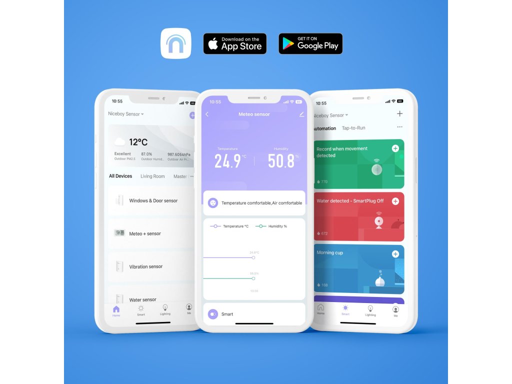 Kompletní ovládání senzoru Niceboy ION ORBIS Meteo Sensor naleznete v mobilní aplikaci Niceboy ION, která navíc podporuje mnoho jazyků (včetně češtiny a slovenštiny). Z aplikace kromě senzorů ovládáte i všechny produkty chytré domácnosti Niceboy ION a jejich ovládání lze sdílet i mezi ostatní členy domácnosti. Ze svého telefonu si u zařízení pohodlně nastavíte parametry, vytvoříte chytré scénáře, časové plány nebo zorganizujete svá zařízení do skupin. Na váš telefon také chytrá zařízení Niceboy ION posílají upozornění a informace o změnách stavu, takže máte vždy přehled, co se ve vaší domácnosti děje.