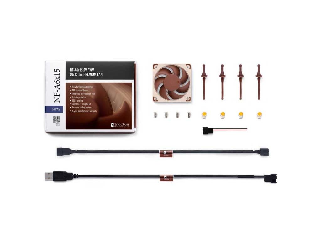 Ventilátor je dodáván s praktickým OmniJoin™ adaptérem pro kompatibilitu s různými typy konektorů, USB napájecím kabelem pro použití s powerbankami a možností napájení přes USB porty. Integrovaná ochrana proti přepólování a ložisko SSO2 prodlužují životnost zařízení, podpořenou 6letou zárukou. NF-A6x15 5V PWM je tak ideální volbou pro náročné uživatele hledající spolehlivý ventilátor s flexibilním výkonem pro 5V zařízení.