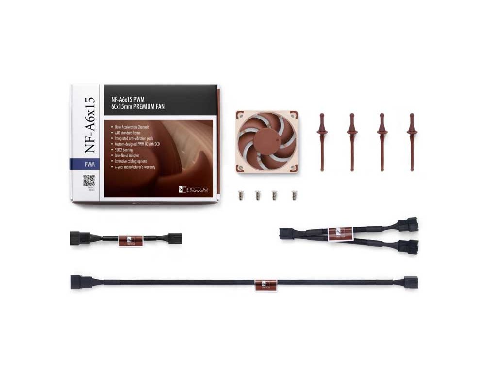 Noctua NF-A6x15 PWM je vysoce optimalizovaný ventilátor s rozměry 60x15 mm, který kombinuje tichý chod a prémiovou kvalitu. Díky vestavěnému čipu NE-FD1 IC umožňuje automatickou regulaci otáček přes PWM (4pinový konektor), s maximálními otáčkami 3500 RPM. Pro ještě tišší chod lze použít Low-Noise adaptér, který sníží maximální otáčky na 3050 RPM. Ventilátor je vybaven ložiskem SSO2, které poskytuje vynikající stabilitu a dlouhou životnost.