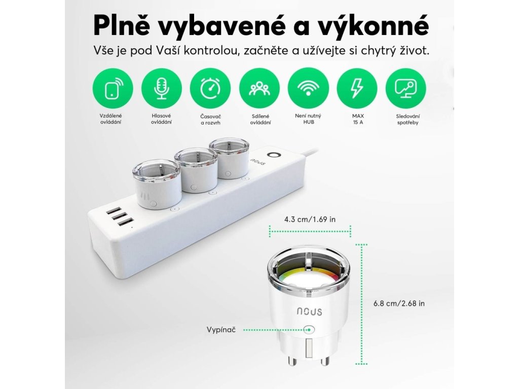 Chytrá zásuvka se sledováním spotřeby energie, výkon 3450 W (15 A), zařízení lze ovládat odkudkoli, časovač a plánování, bezplatná aplikace Nous Smart Home pro Android a iOS