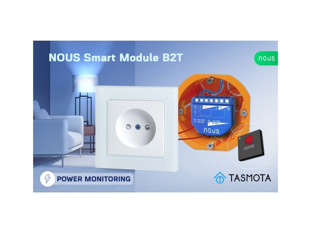 Chytrý vypínač NOUS B2T s nainstalovaným otevřeným softwarem Tasmota je určen k organizování automatického a ručního vypínání elektrických spotřebičů v místnosti prostřednictvím vzdáleného přístupu přes Wi-Fi síť, pomocí chytrého telefonu nebo z osobního počítače přes webového rozhraní. Komunikace s přepínačem se konfiguruje přes Wi-Fi síť, k čemuž slouží bezdrátový Wi-Fi adaptér. Vypínač je vybaven mechanickým tlačítkem a světelnou indikací stavu zařízení. Zařízení je vybaveno elektromechanickým relé a podporuje protokol Matter .