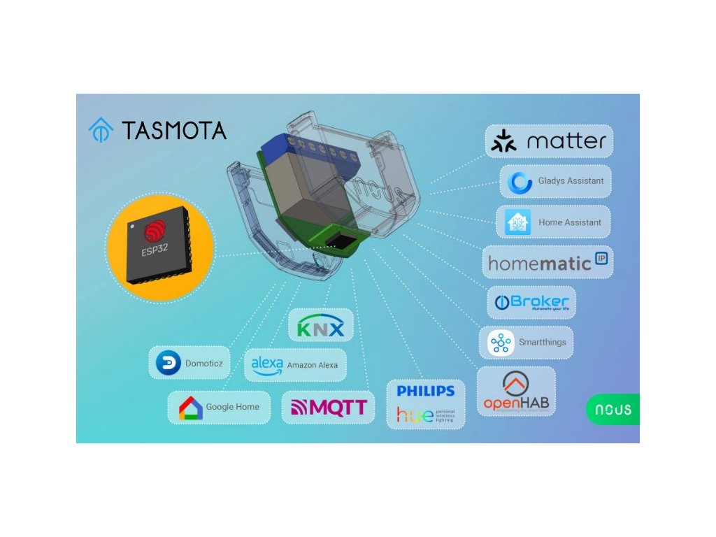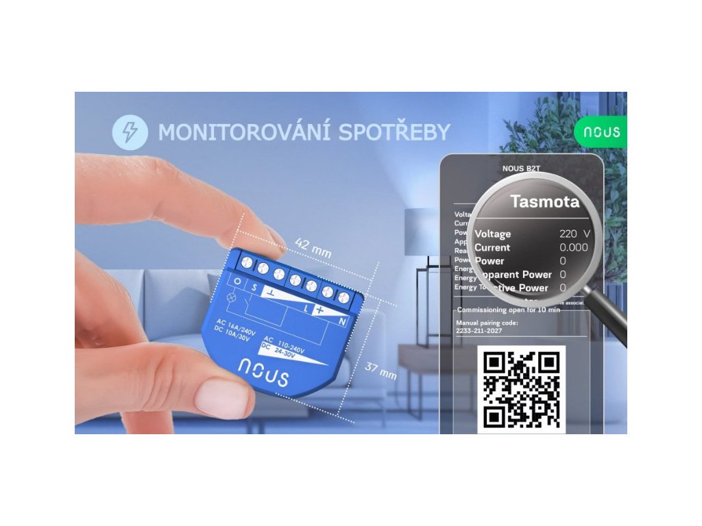 Chytrý vypínač NOUS B3T s nainstalovaným otevřeným softwarem Tasmota je určen k organizování automatického a ručního vypínání elektrických spotřebičů v místnosti prostřednictvím vzdáleného přístupu přes síť Wi-Fi, pomocí chytrého telefonu nebo z osobního počítače přes webové rozhraní. Komunikace s přepínačem se konfiguruje přes Wi-Fi síť, k čemuž slouží bezdrátový Wi-Fi adaptér. Vypínač je vybaven mechanickým tlačítkem a světelnou indikací stavu zařízení. Zařízení je vybaveno elektromechanickým relé a podporuje protokol Matter.
