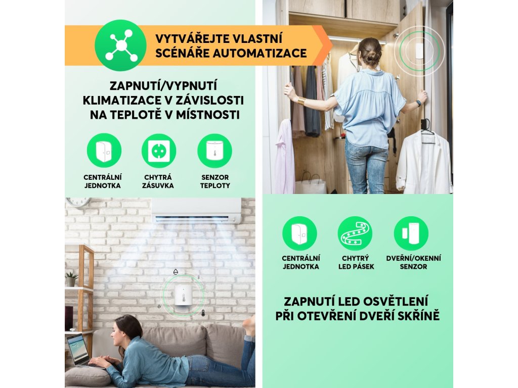 Pomocí centrální jednotky ZigBee můžete rychle rozšířit systém domácí automatizace o bezdrátové produkty, jako jsou čidla zaplavení, teplotní čidla, čidla otevření, čidla pohybu nebo hlavice termostatu.