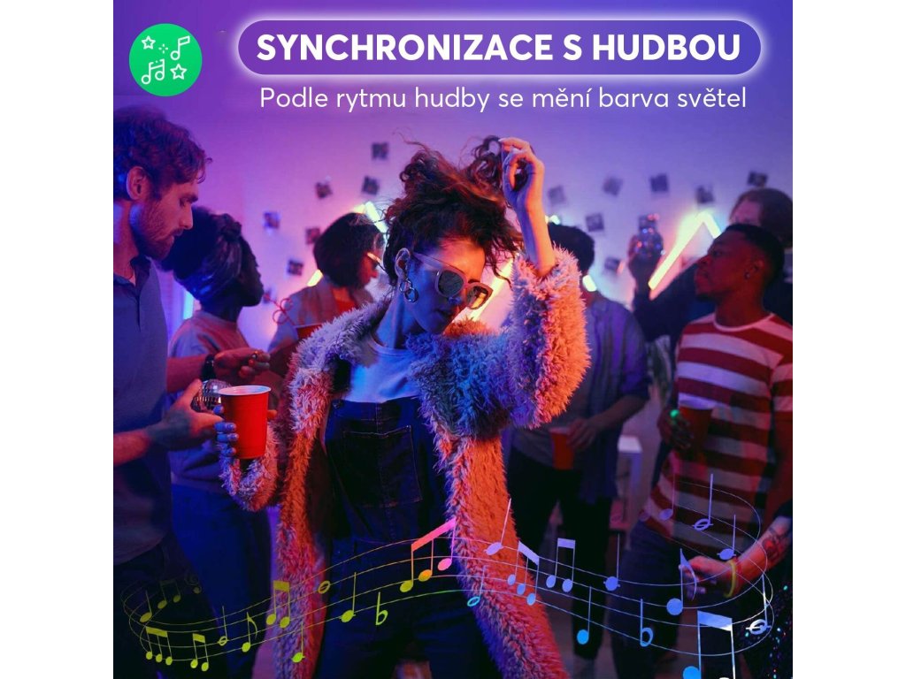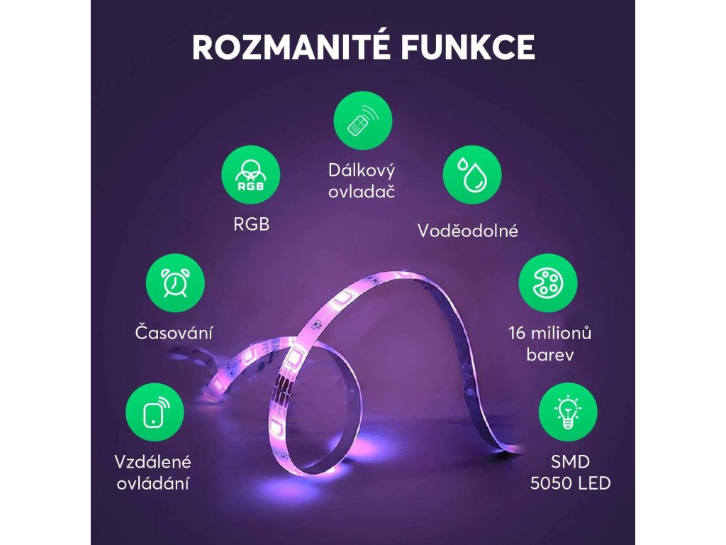Chytrý RGB LED pásek, jmenovitý světelný tok 1700lm, jmenovitý výkon 36W, RGB 16 milionů barev, kompatabilita Tuya Smart (Android a iOS), životnost 25000 hodin, délka 10m, časovač, synchronizace hudby