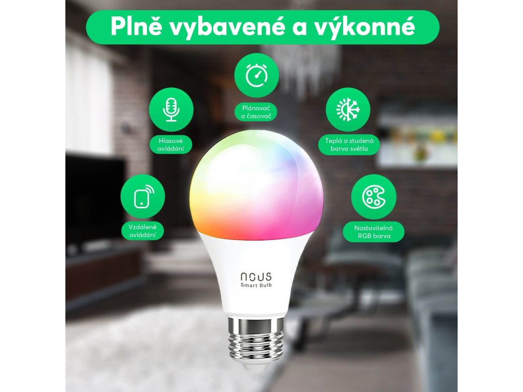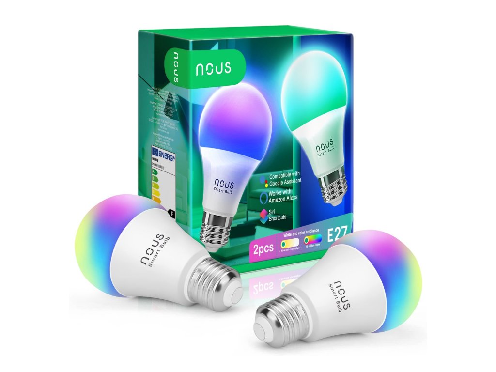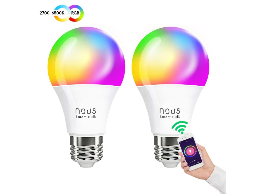2x chytrá žárovka s paticí E27, RGB 16 milionů barev, výkon 9 W, jas 810 lm, možnost nastavení časovače a plánování scénářů, aplikace Nous Smart Home pro Android a iOS, podpora Tuya Smart