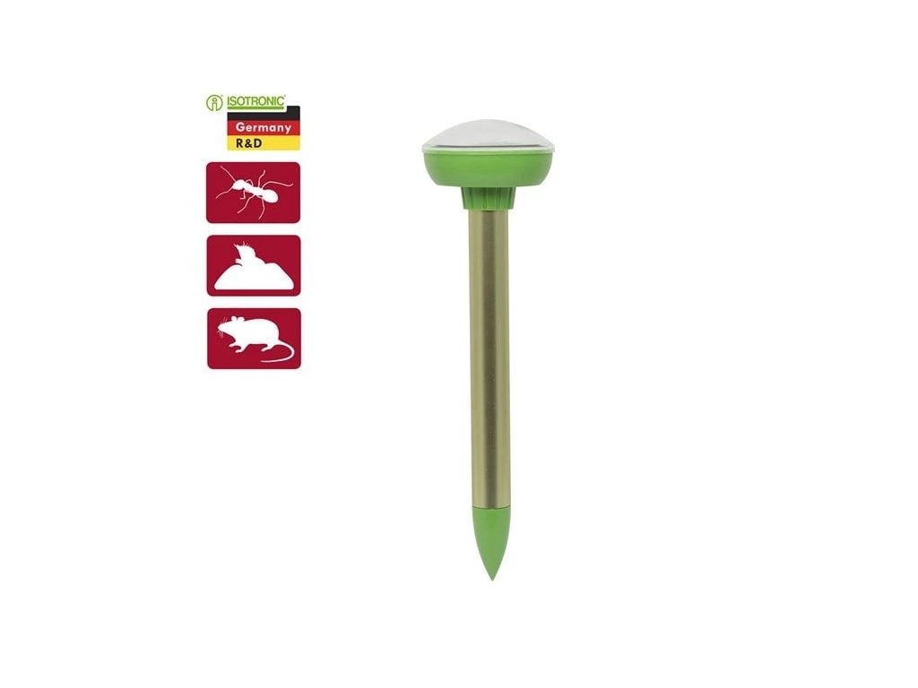 Inovativní Solární odpuzovač mravenců, krtků, myší je jedním z řady vynikajících produktů firmy Isotronic. Napájen je prostřednictvím solárního panelu, je přenosný a velmi účinný. Dá se kdekoli používat, bez jakýchkoli chemických přípravků a ohrožení životního prostředí. Koupí tohoto výrobku jste získali moderní odpuzovač škůdců. Výrobek generuje vibrační vlny přibližně každých 40 sekund o frekvenčním rozsahu 400-800 Hz ± 50 Hz. Tyto speciální zvukové a vibrační vlny při testech na volném prostranství v optimálním případě dokázaly pokrýt plochu asi 700 m2. Účinnost se liší v závislosti na stavu půdního podkladu. Protože mnoho zvířat žijících v zemi nesnáší tyto zvukové vlny a vibrace, tak se po pár dnech přestěhují jinde. Na jiná užitečná zvířata nemá výrobek žádný účinek. Výrobek můžete použít v zahradě, na poli či jiných užitných plochách na odpuzování hlodavců. Přesně nastavená elektronika a účinný solární panel zajišťují nepřetržitou činnost i při slabším světle. Tento výrobek odplaší hraboše, myši, krtky, mravenci, hadi a jiná zvířata žijící v půdě.