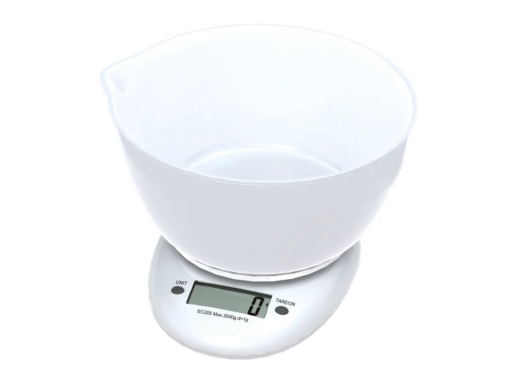 Digitální kuchyňská váha s mísou, max.nosnost: 3kg, přesnost vážení: 1g, dotyková tlačítka, displej: LCD 44 x 26 mm, mísa: 1,5l, baterie: 1 x CR2032 (součástí balení), jednotky vážení kg/ lb, automatické vypnutí, Indikátor přetížení a vybité baterie.
