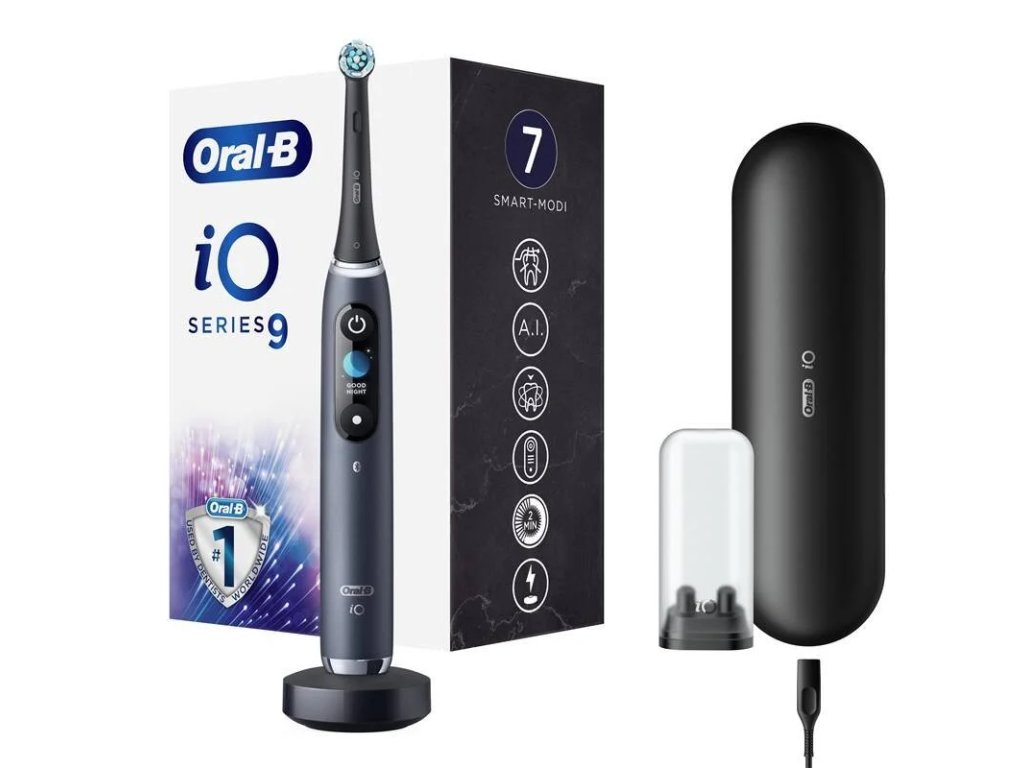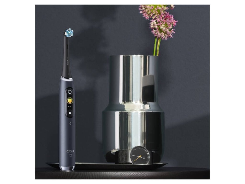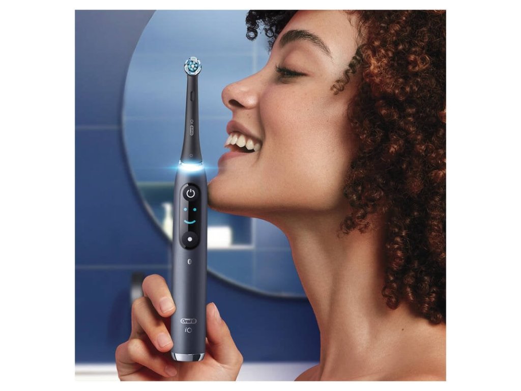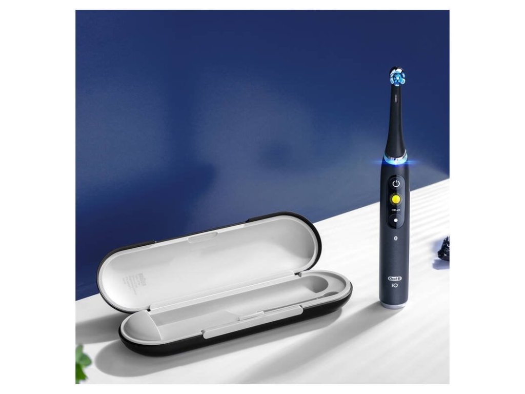 elektrický zubní kartáček • 5 režimů čištění • akumulátor • technologie iO – jemné vibrace • senzor tlaku • smart funkce • časovač 4× 30 s • interaktivní barevný displej • Bluetooth • nabíjecí stojánek, cestovní pouzdro, držák nástavců