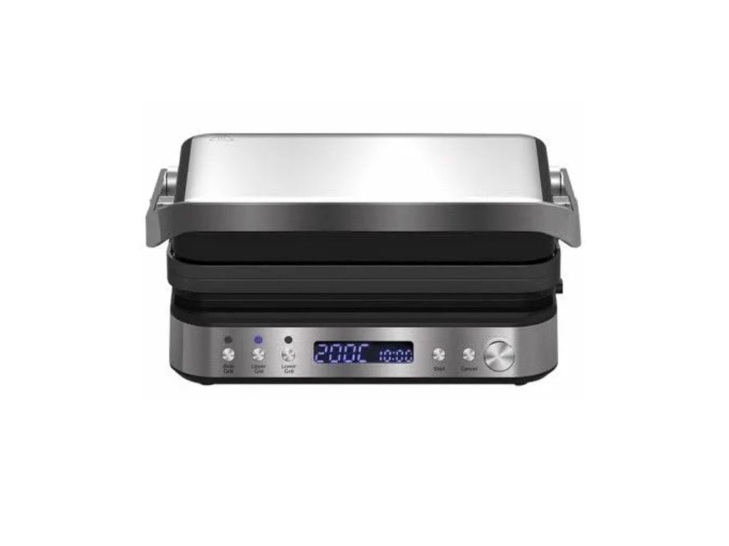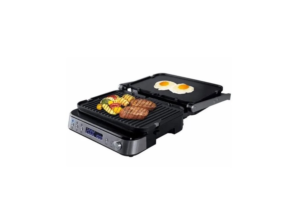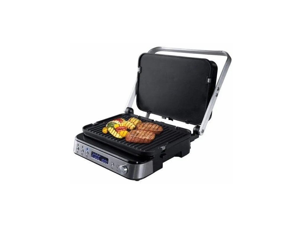 Elektrický stolní gril s příkonem 2000 W. Orava Grillchef 3 nabízí funkci otevřeného i kontaktního grilu, samostatně regulovatelnou teplotu pro každou plochu samostatně a variabilní nastavení teploty 80 až 230 °C. Snadné čištění