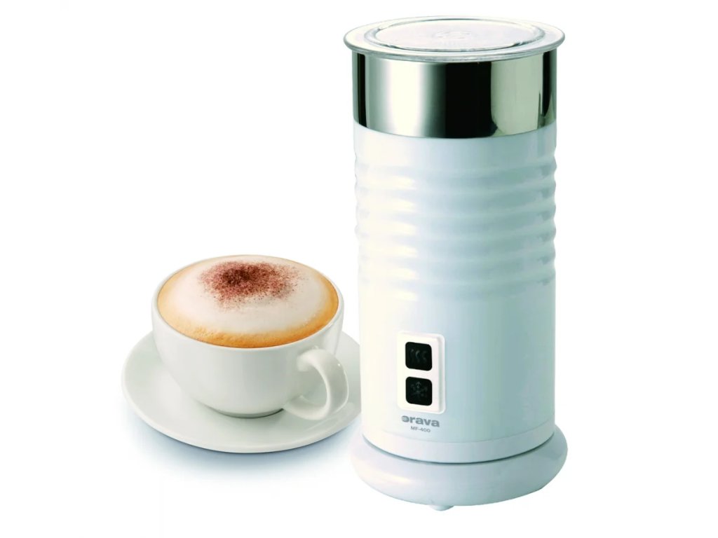 napěňovač mléka • příkon 400 W • objem 240 ml • odnímatelný podstavec • průhledný kryt se silikonovým těsněním • vhodný pro přípravu caffe latte a kapučína